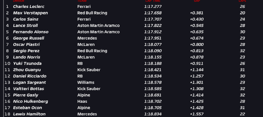 El compañero de Checo Pérez en Red Bull, Max Verstappen, terminó en la segunda posición. A pesar de enfrentar algunos problemas con su monoplaza que le hicieron perder unos 15 minutos de la sesión, el tres veces campeón del mundo logró regresar a la pista con su RB20 y gradualmente mejoró su posición en la clasificación. Sin embargo, quedó a .381 segundos del tiempo de Leclerc.