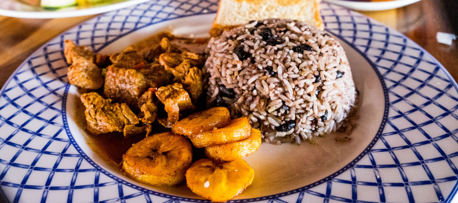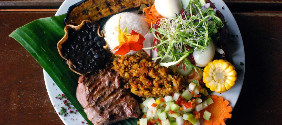 La gastronomía costarricense se caracteriza por su frescura y diversidad, con platos que destacan ingredientes locales como el arroz, los frijoles, el maíz, el plátano, el pescado y mariscos frescos, así como una variedad de frutas tropicales. Uno de los platos más emblemáticos es el "gallo pinto", un desayuno tradicional que combina arroz y frijoles sazonados con cebolla, chile dulce y especias, servido con huevos, plátanos fritos y tortillas de maíz.