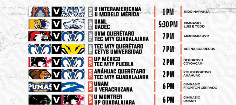 El día continúa con emocionantes enfrentamientos, como el que tendrán la UNAM y UV a las 6:00 p.m. en el Gimnasio Frontón Cerrado, así como el encuentro entre MONTRER y UP GUADALAJARA en una sede por definir.