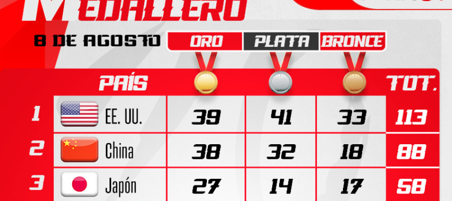 Japón completó el podio en tercer lugar con 20 medallas de oro, seguido por Australia con 18 y Francia con 16. Otros países destacados en el top 10 fueron Holanda (15 oros), Gran Bretaña (14), Corea del Sur (13), Italia (12) y Alemania (12).