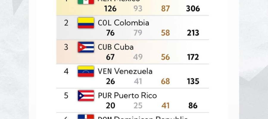 Hasta el momento, México ha logrado conquistar un total de 309 medallas, con 129 de oro, 92 de plata y 88 de bronce. Su más cercano competidor, Colombia, se encuentra en segundo lugar con 214 medallas, mientras que Cuba se mantiene en el tercer puesto con un total de 172 medallas. A pesar de que los juegos están por concluir en pocos días, México tiene la meta de seguir sumando medallas y superar la cifra de 350 en total.
