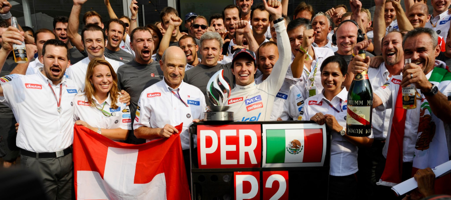 En 2012, PER consiguió su primer podio durante el GP de Malasia. En su Sauber C31, Sergio estaba segundo detrás del Ferrari que conducía Fernando Alonso. De hecho, tuvo unas cuantas oportunidades para rebasar al 2 veces campeón del mundo. Sin embargo, un error de PER lo alejó de toda posibilidad de conseguir su primera victoria en la F1. Posteriormente, en el GP de Canadá, PER consiguió su segundo podio al quedar 3°, por detrás de Hamilton y Grosjean y volvió a subirse al podio en Italia después de salir del cajón 13 y terminar 2° compartiendo podio con Hamilton, quien ganó, y Alonso.