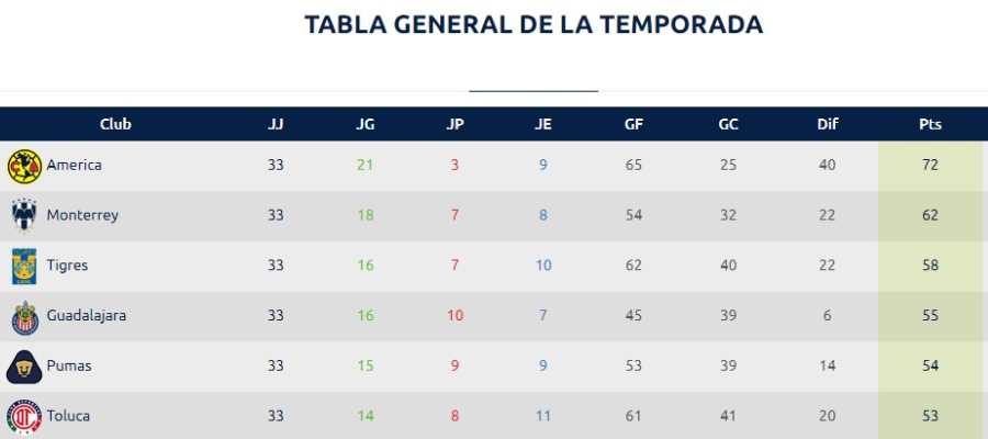 La tabla general de la temporada 2023-24 de la Liga MX muestra los primeros seis puestos, que incluyen a los tres equipos ya clasificados para la CONCACAF Champions League 2025 y a aquellos que aún tienen posibilidades matemáticas de hacerlo. Toluca está en la lucha y buscará asegurar su lugar en este prestigioso torneo continental.
